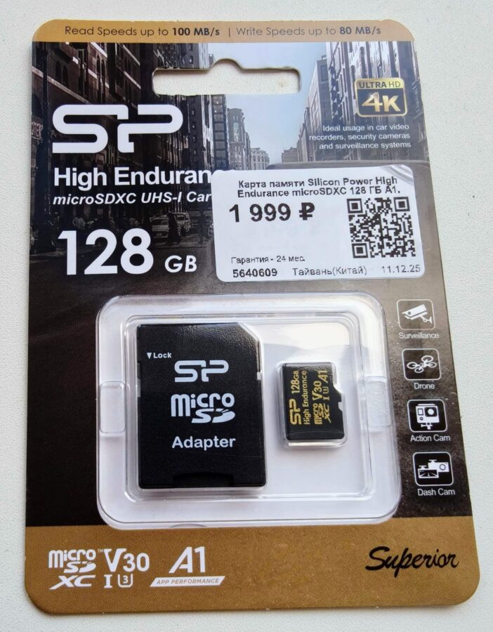 По прибытию в Саратов срочно купил две карты памяти. Первую — Silicon Power High Endurance на 128 гигабайт. Она изначально предназначена для камер видеонаблюдения и других задач, где видео записывается много и непрерывно. Ее я вставил в Cootli CI-IIWF237 вместо паленого «кингстона» и включил режим непрерывной записи. Работает безупречно, Наташу больше тревожить не надо.
