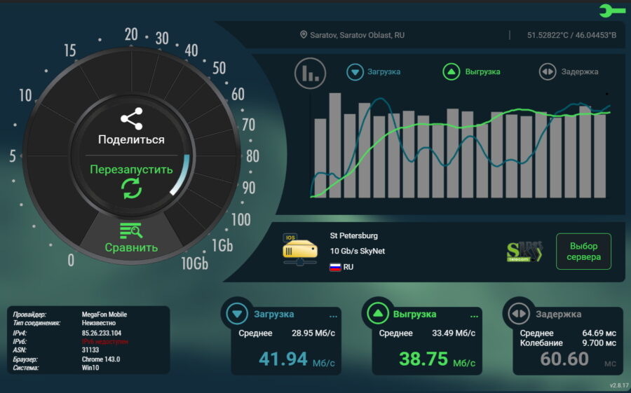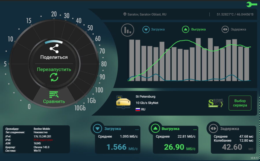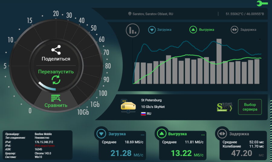 Для замеров использовались забугорный сервис Nperf и наш Яндекс Интернетометр.