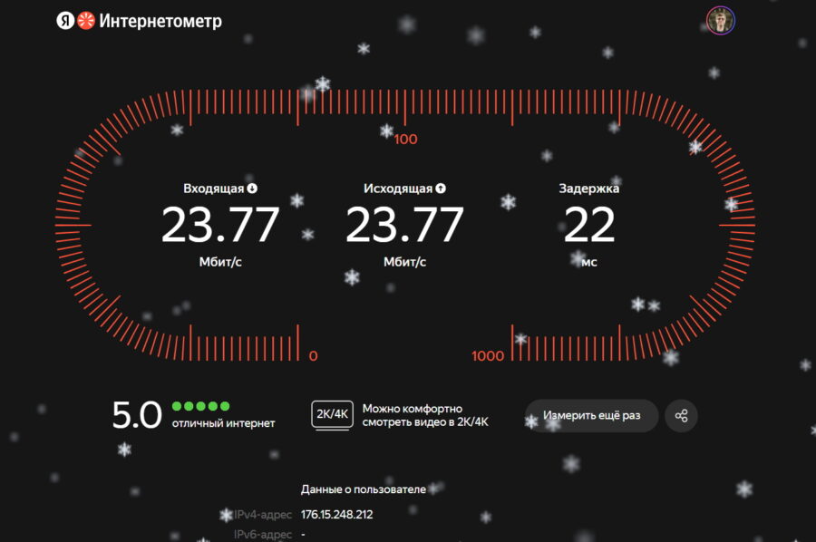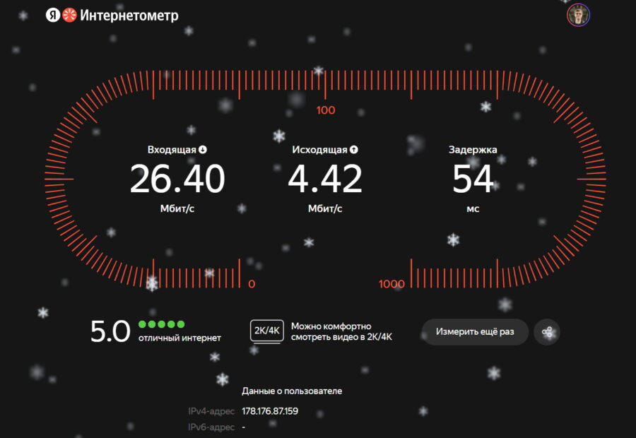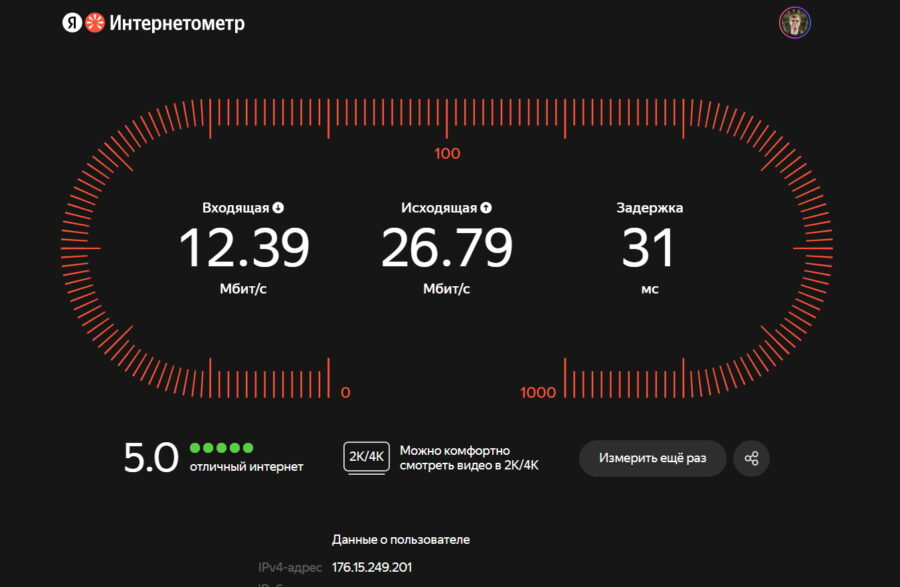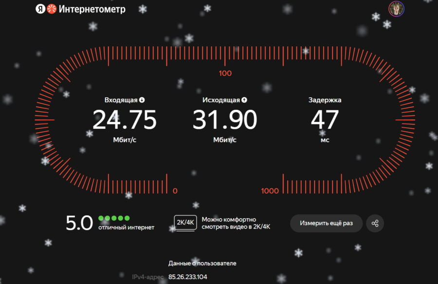 Nperf и Интернетометр показали на Cudy P2 примерно одинаковую входящую скорость, а вот исходящий трафик на отечественном сервисе ходит вдвое быстрее. Это немного странно, потому что Nperf использовал сервер в Санкт-Петербурге, но уж как есть. Пинг в Интернетометре оказался у Билайна тоже вдвое ниже.