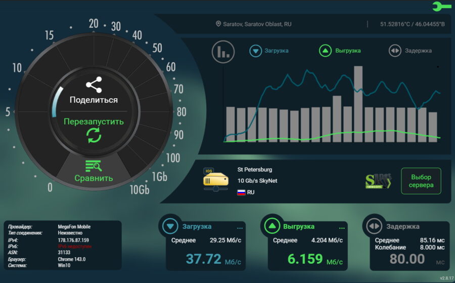 На Мегафоне Cudy P2 показал примерно одинаковые результаты и в Nperf, и в Интернетометре. Исходящая скорость была немного выше входящей.