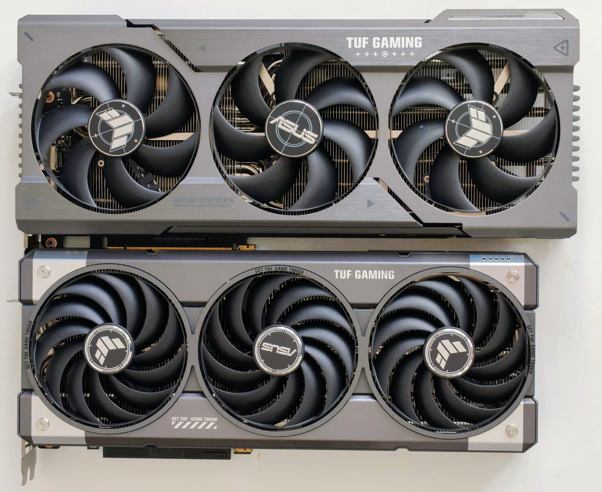 ASUS TUF Gaming Radeon RX 9070 XT существенно короче и тоньше флагманов прошлого поколения, которых она безжалостно обгоняет. Питание осталось прежним – три 8-контактных разъема питания стандарта PCIe 2.0. Это не так краcиво, как на ускорителях Nvidia с их 16-контактным 12VHPWR. Но зато можно использовать относительно старые, но все еще отличные блоки питания без необходимости колхозить переходник. Мне такой подход ближе.