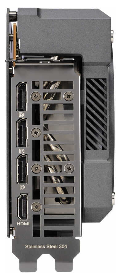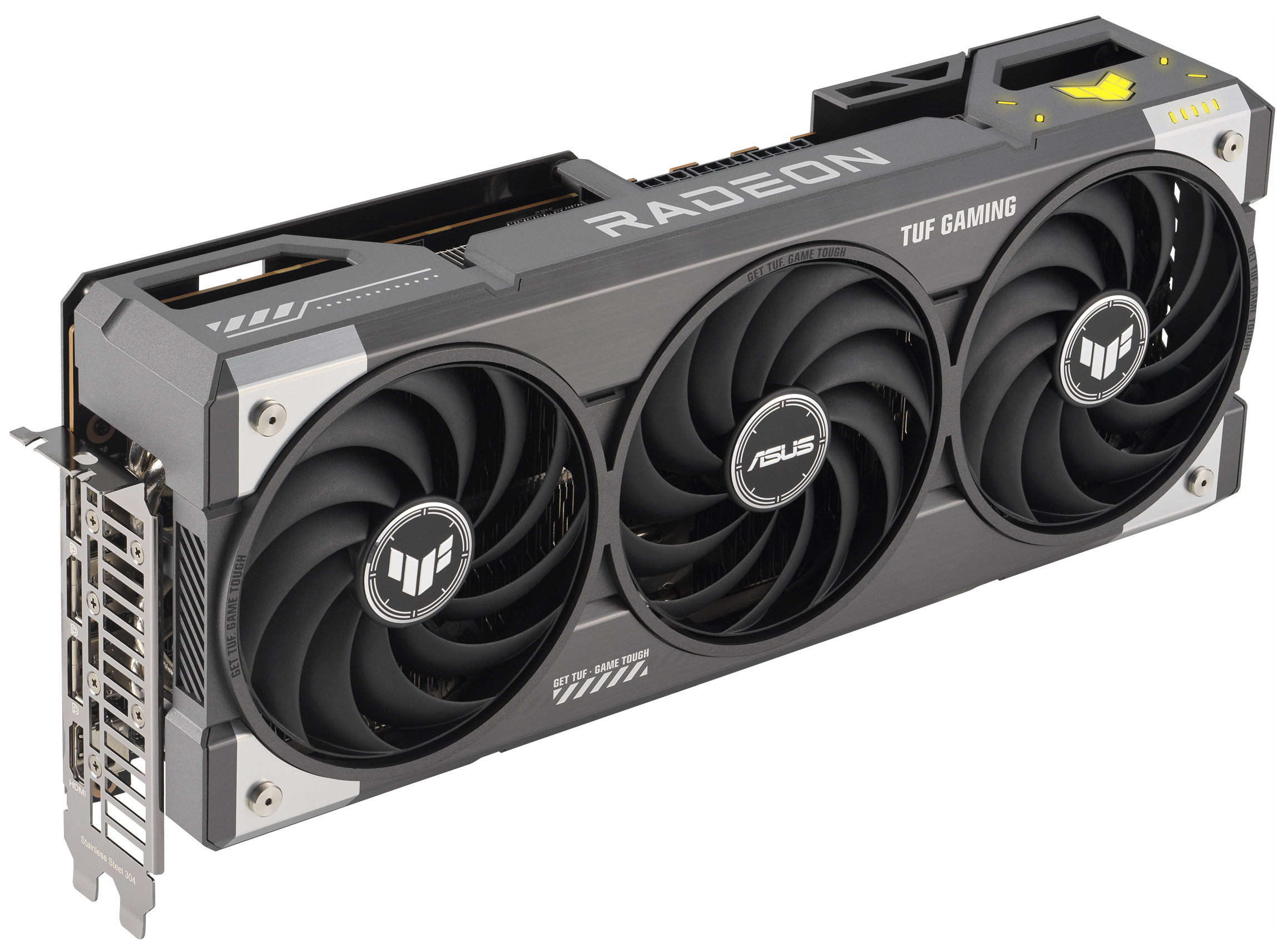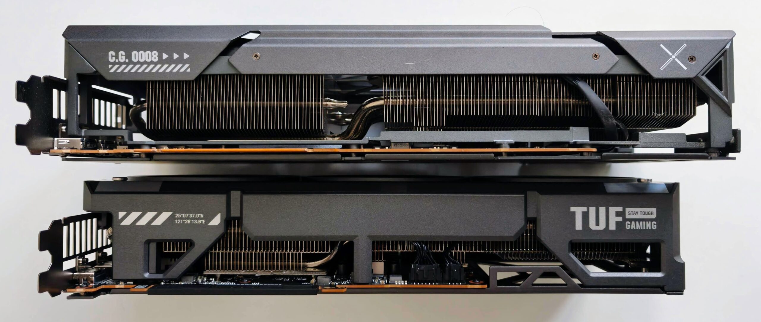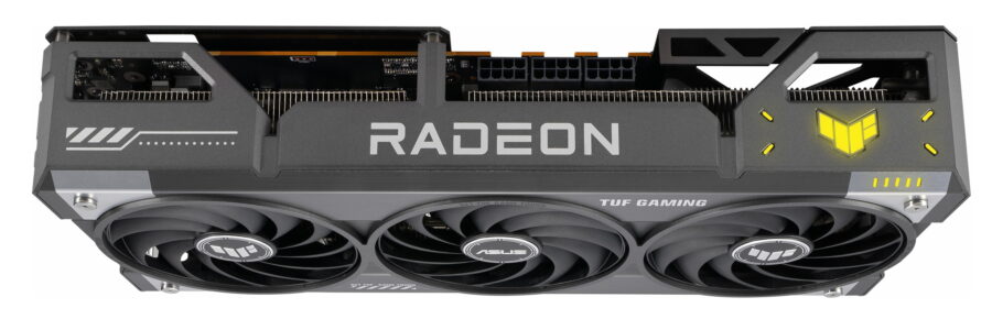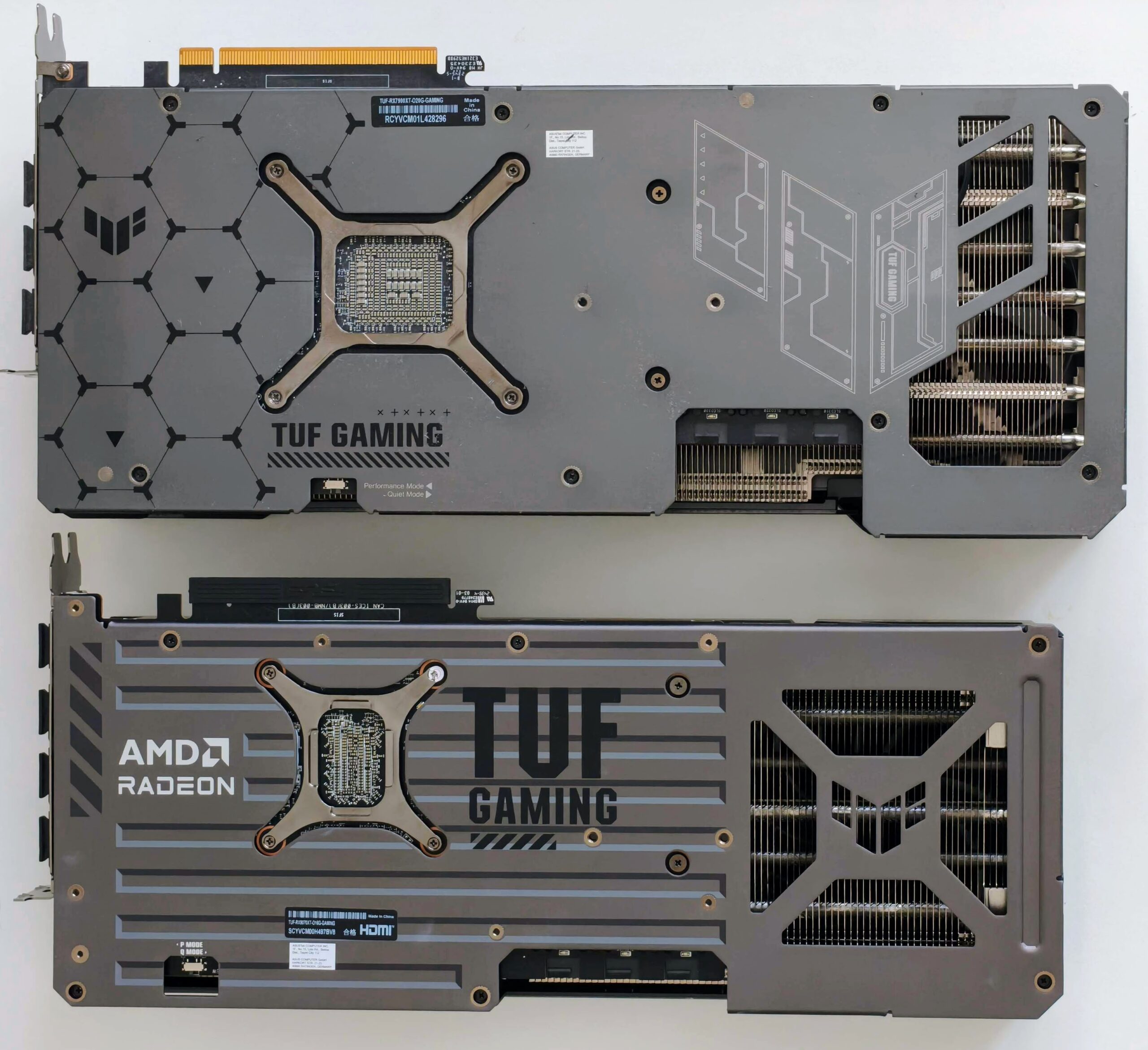 ASUS TUF Gaming Radeon RX 9070 XT существенно короче и тоньше флагманов прошлого поколения, которых она безжалостно обгоняет. Питание осталось прежним – три 8-контактных разъема питания стандарта PCIe 2.0. Это не так краcиво, как на ускорителях Nvidia с их 16-контактным 12VHPWR. Но зато можно использовать относительно старые, но все еще отличные блоки питания без необходимости колхозить переходник. Мне такой подход ближе.