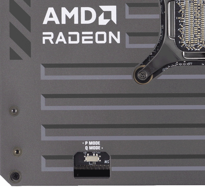 Традиционно на видеокарте присутствует переключатель «производительного» и «тихого» режимов. Он немного влияет на максимальные частоты чипа, но излишне верить в достижение тишины таким простым способом не стоит. Дело в том, что даже «тихий» режим все равно выше по частоте, чем референсные значения для 9070 XT, а в «производительном» они выше весьма конкретно. Поэтому истинная тишина достигается только копанием в драйверах, что не очень сложно, особенно с учетом увеличенных возможностей уменьшения общего энергопотребления.
