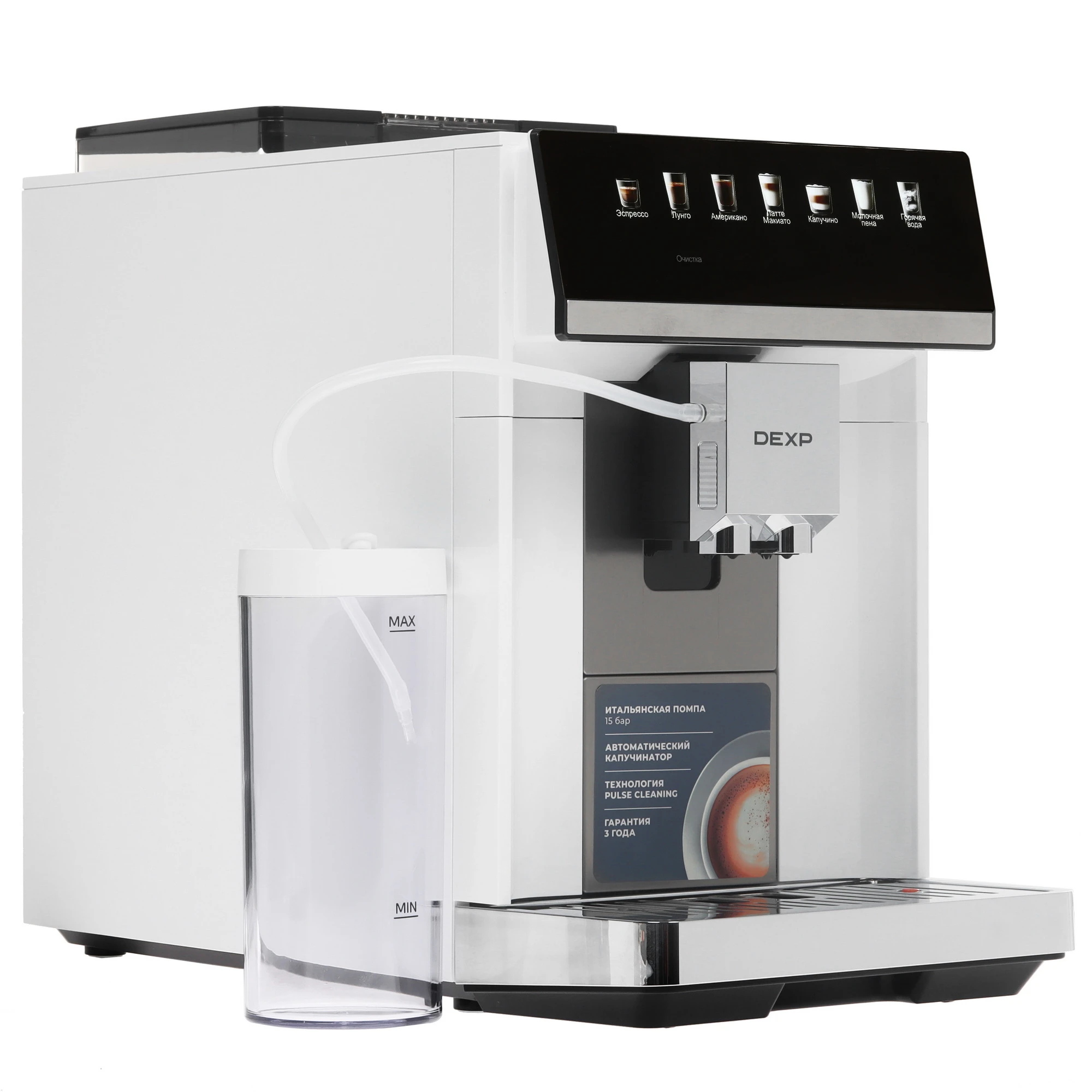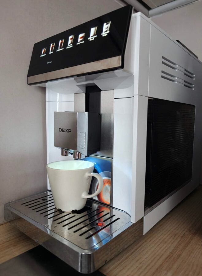 Компания продает технику и под собственным брендом, но именно кофемашин в России не найти. Под брендом DEXP продают версии в черном и белом корпусах. По характеристикам они идентичны, но белая почему-то на две тысячи рублей дешевле. Естественно, выбрал именно ее.