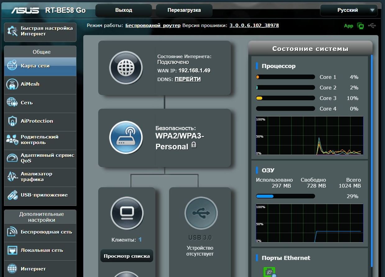 Внутри стандартная, полнофункциональная прошивка ASUS, и, естественно, при желании всё можно настроить на свой вкус. Когда я говорю «всё», то имею в виду широкий набор умений, которыми заслуженно славится операционка ASUS. Mesh, разные сорта VPN, удаленное управление через приложение ASUS Router и много чего еще – в наличии.