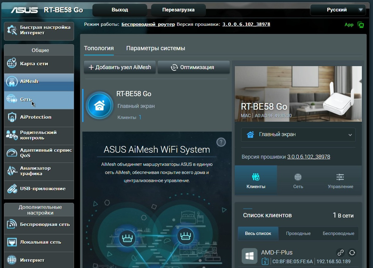 И еще я обещал вам рассказать о полезном использовании WAN-порта на 2.5 Гбит. Поскольку это полноценный роутер ASUS, он может работать и ретранслятором mesh-сети. Если у вас продвинутый контроллер с ускоренными портами, можно подключить к нему ASUS RT-BE58 Go кабелем. С точки зрения цены будет не вполне оптимально, потому что ретранслятор можно найти подешевле. Но смысл в этом порте, несомненно, появится.