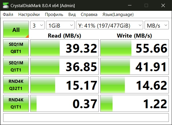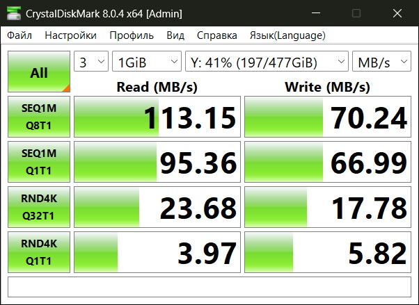 По Wi-Fi же скорость резко падает. Даже в Wi-Fi 7, даже при максимальной скорости линка 2800 Мбит/с чтение получается в районе 40 мегабайт, а запись около 56. Жить можно. И для раздачи мультимедийного контента, даже повышенной чОткости, этого с запасом. Но от четырех ядер на частоте 2 ГГц ждешь более ярких результатов. Иначе – зачем они тут?