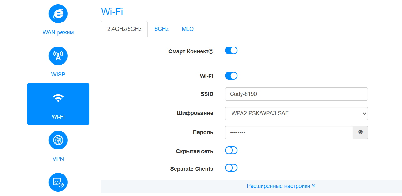 Настройки сети 6 ГГц вынесены в отдельный пункт меню – видно, что это пока новинка, и в общие настройки диапазонов ее не интегрировали. И объединить все сети под одним именем не получится. Точнее, почти не получится. Привычный режим Smart Conneсt возможен только для диапазонов 2.4 и 5 ГГц, а 6 ГГц будет болтаться отдельно. Если хочешь прямо все три, включай режим MLO, и тогда чудо случится. Вот только этот режим, забегая немного вперед, снижает скорость работы, и получить максимум от 6 ГГц с ним не получится. Так что лучше оставить 6 ГГц самостоятельной сетью, что, в общем, и более логично.