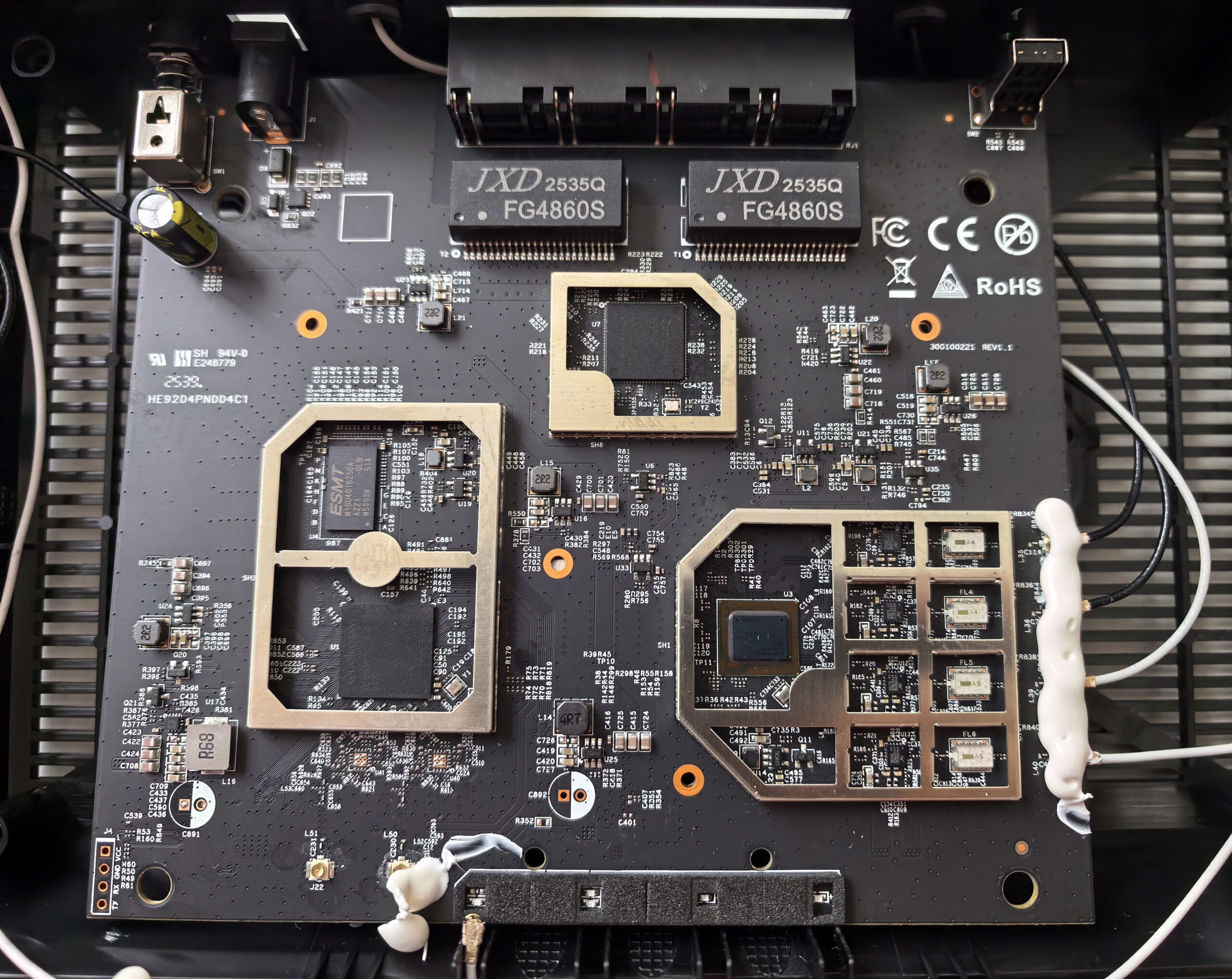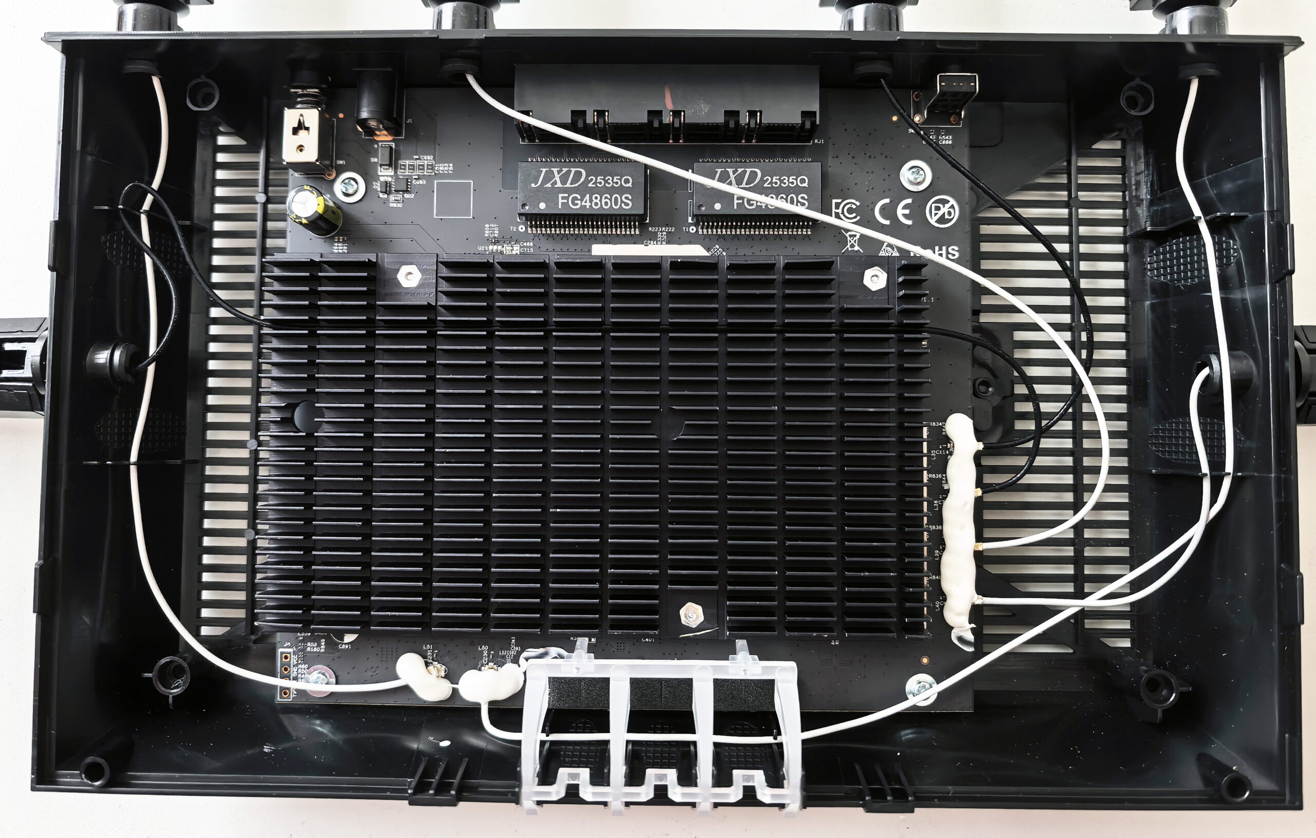Внутри роутер выглядит простенько, но чистенько. Массивный радиатор крепится на винтах, так что при желании можно под него заглянуть. Под экранами нас встречает чипсет IPQ5322 и еще два чипа, идентифицировать которые я не смог из-за очень нечеткой маркировки. Вижу, что тоже Qualcomm, и, скорее всего, QCN9274/QCN6274, но доказать не могу. В целом заметно, что делали просто и надежно, особо не обращая внимания на внутреннюю красоту. Все равно под радиатор мало кто полезет, да и желающих снимать верхнюю крышку не так много.