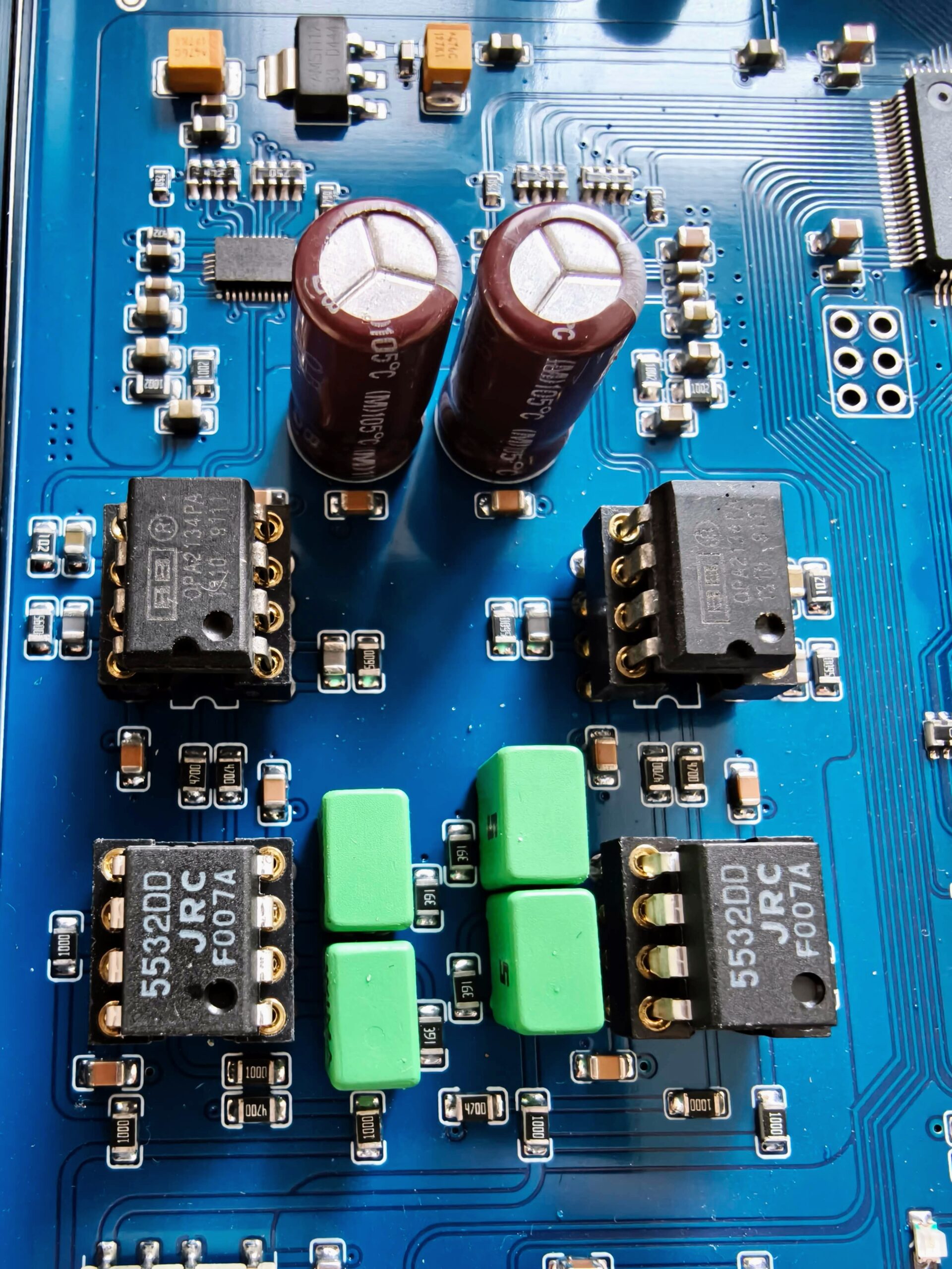 Операционных усилителей установлено аж пять штук. Два NE5532 и три OPA2134. Один из «оп» отвечает за выход на наушники, но, честно говоря, выход настолько никакущий, что в этой роли я его сразу решил не использовать.