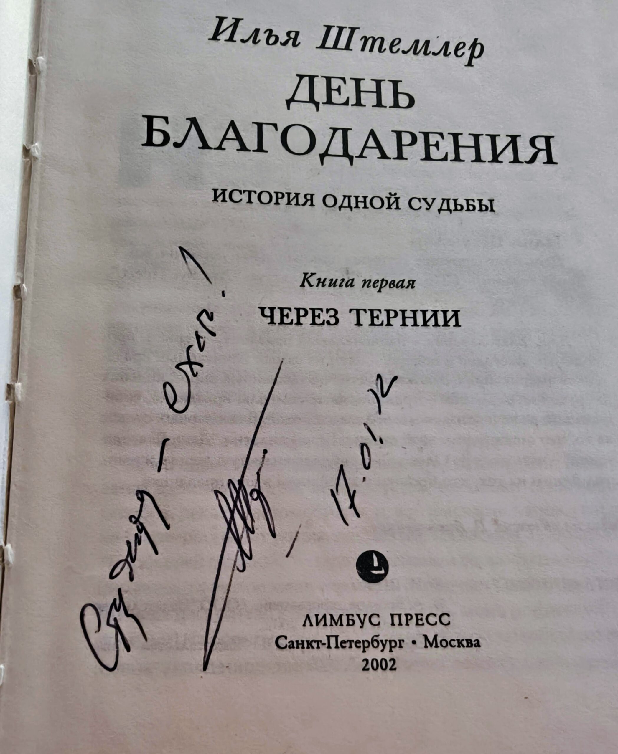 Вы спросите, а причем тут «Авито»? Дело в том, что почти все книги Штемлера я прочитал в электронном виде. Но для нашей еженедельной передачи «Тактическая Суббота» мне понадобилась бумажная книга для демонстрации в кадре. На «Авито» вторым предложением выпал двухтомник «День благодарения», который мне раньше не попадался. Там было написано, что книга с автографом, но, честно говоря, я этому особого значения не придал, потому что цена была как за другие книги без него. Подумал, может просто какая-то дарственная надпись. Но когда книга уже приехала ко мне, и я проверил в интернете – как выглядела подпись Ильи Петровича, оказалось, что автограф самый, что ни на есть авторский! Вот это да!