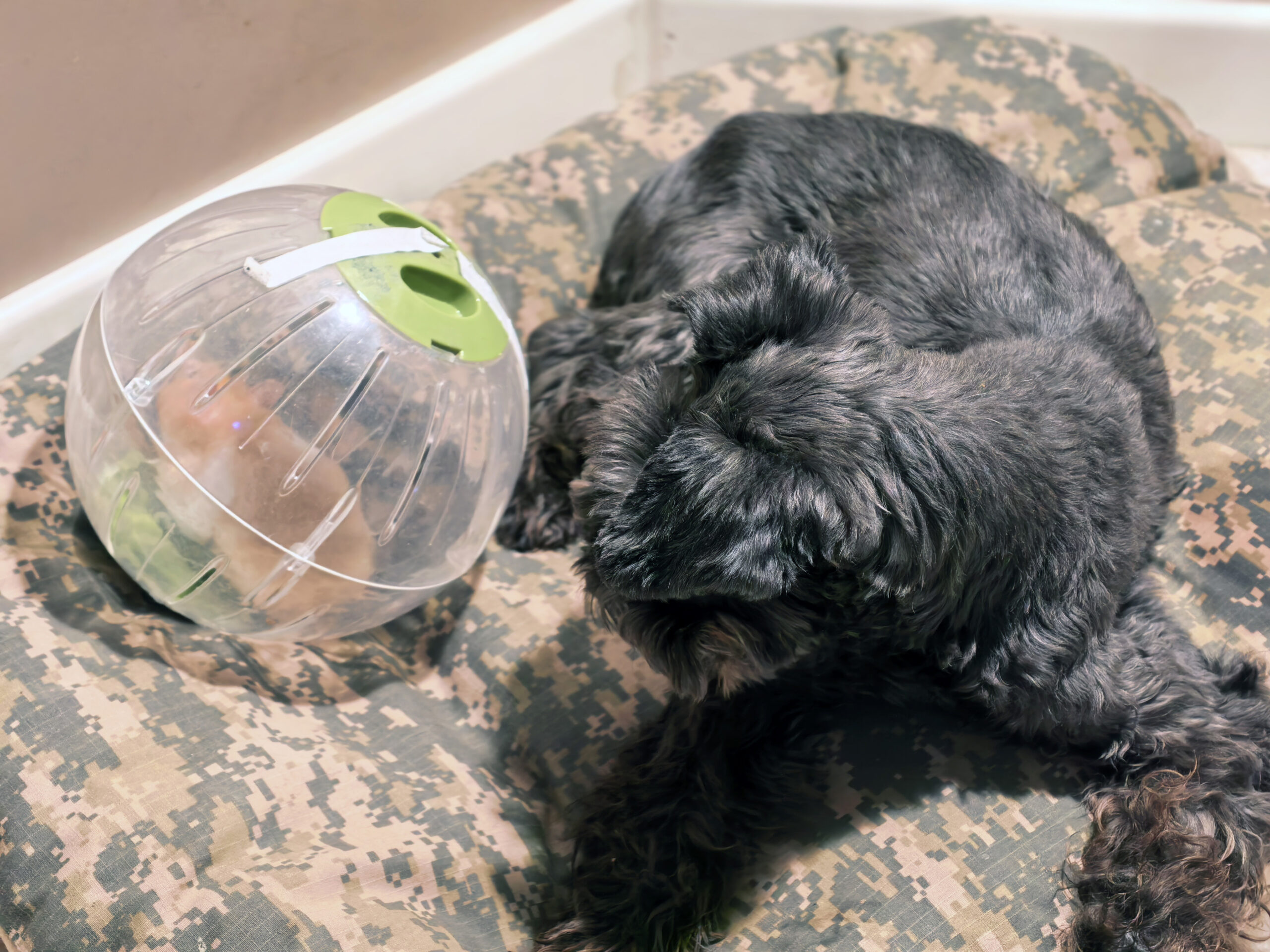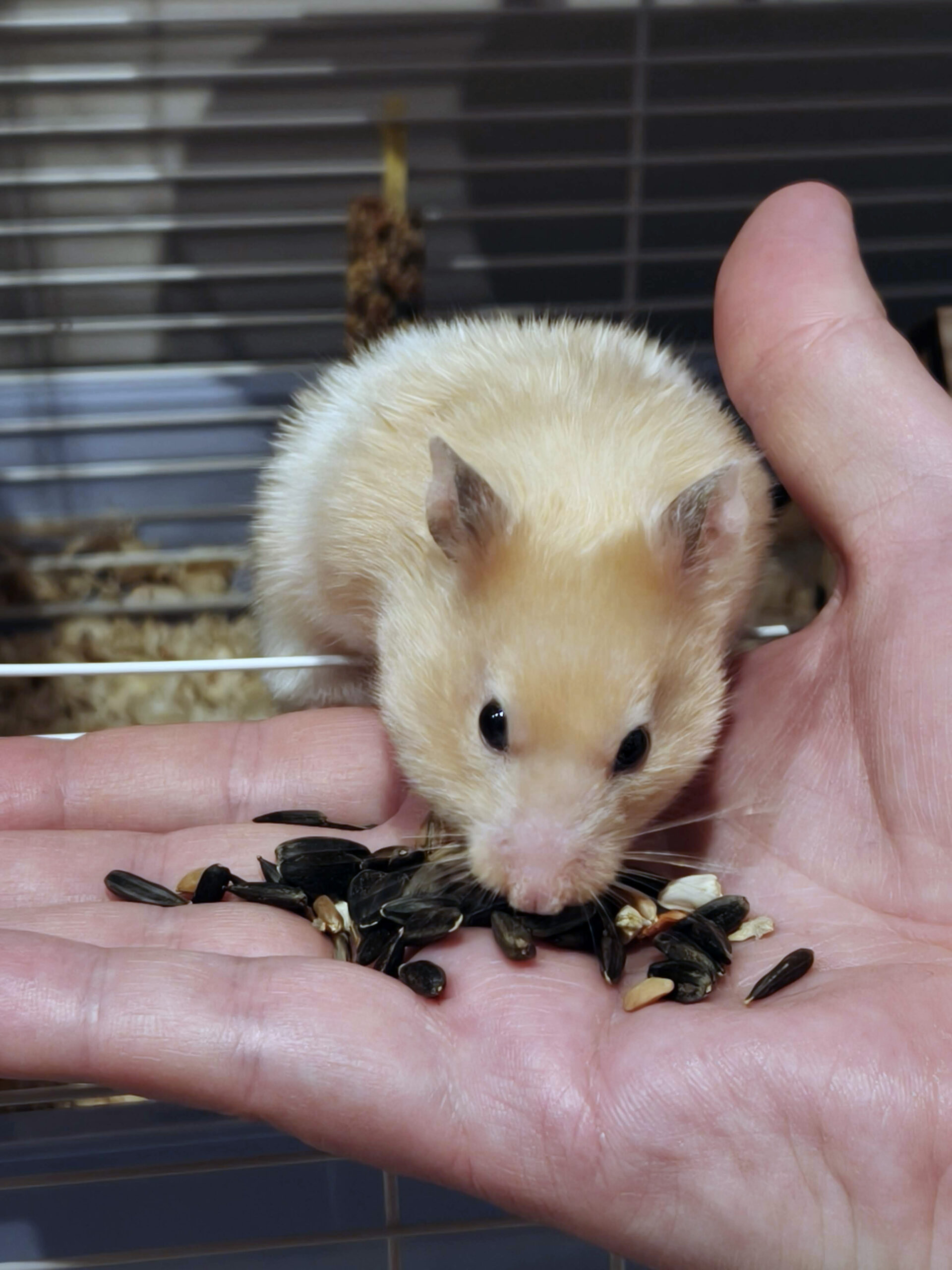 Дома клетку собрали, насыпали корма, налили воды, и выгрузили туда из переноски Мику. Хомячиху в дороге несколько укачало, так что, пошарахавшись по первому этажу, она пошла спать.